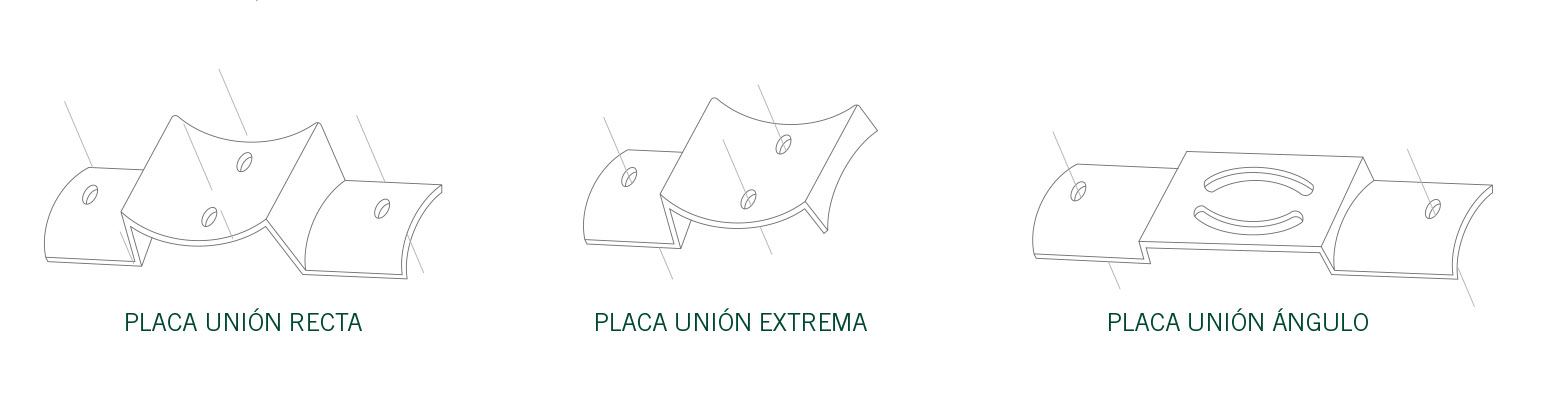- Las unión entre postes y travesaños se realiza mediante soportes galvanizados y puede ser de tres tipos: recta, extrema y en ángulo.